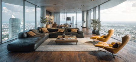 A contemporary living space features large windows overlooking a sprawling cityscape. The room is furnished with a dark sectional sofa, leather armchairs, and a wooden coffee table. The composition emphasizes natural light and a sense of openness. Suitable for architectural, real estate, or lifestyle content.