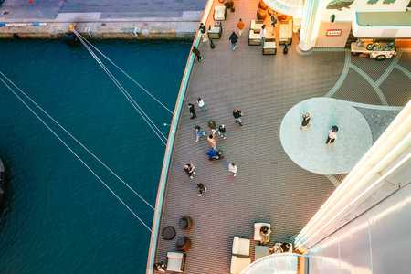Barcelona, Spain - December 1, 2023: Lounge promenade deck on cruise ship. Interior of luxury cruise restaurant with tables and armchair in sunset at sea