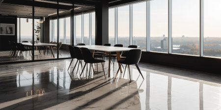 Conference room with meeting table many seats reflective floor, window with city view. Generative AI AIG18.