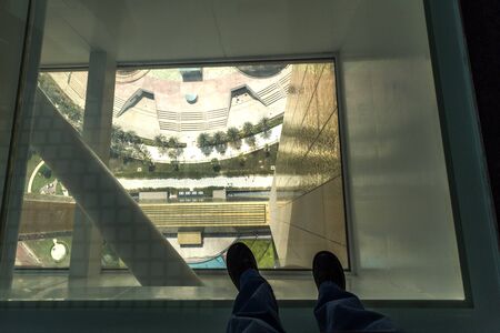 Clear glass view from the tower floor circa 138 m above the ground outside, at Dubai Frame.