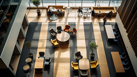 Top view on modern open space office with comfortable workplaces. Overhead view of business people are working together. By generative Ai