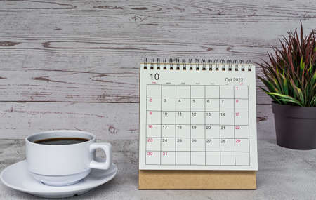 White October 2022 calendar with potted plant and coffee cup on wooden desk. 2022 new year concept. Copy space.