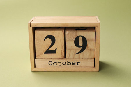 Wooden calendar with the date October 29 and pumpkin on a wooden table.