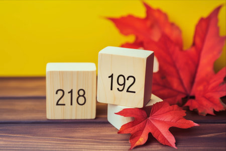 Wooden blocks against a rustic wood background with pumpkins and autumn leaves. Background with candle and pumpkin. Autumn background. Autumn months.