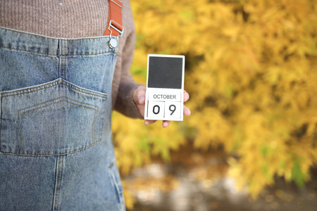 Woman holding calendar with date October 20 on yellow autumn leaves background