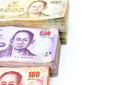 Stack of Thai money on white background use for money background concept, Various types of Thai currency banknotes on white background.