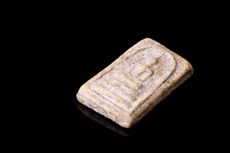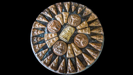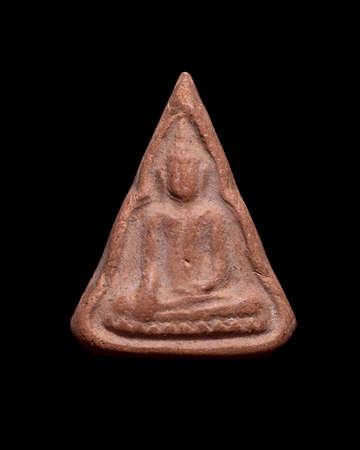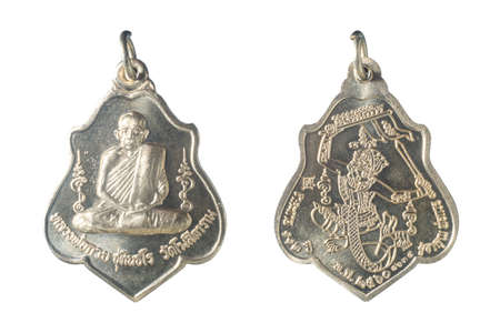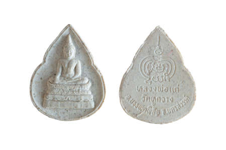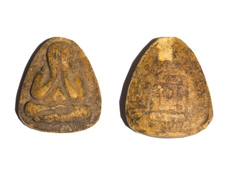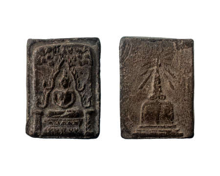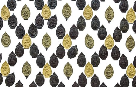 Amulets, Thai Buddha amulet, or votive tablet, made of metal or terracotta isolated on white background. The amulet is popular for Thai people as a tool to help enhance luck in different aspects of life