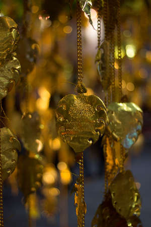Several golden Pho tree leaves are hanging for decoration. Pho leaf, silver & gold For allusions
