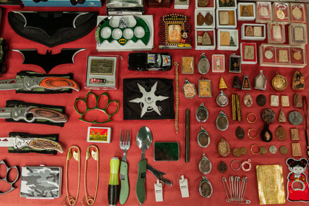 Bangkok, Thailand - amulet market with stone and metal Buddhist talismans bringing luck and good fortune.