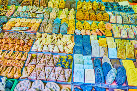 The variety of amulents from different materials on buddhist theme in Tha Prachan Amulet Market in Bangkok, Thailand
