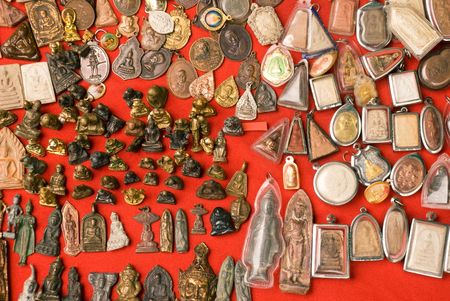 A series of metal and clay Buddhist amulets from a market in Bangkok