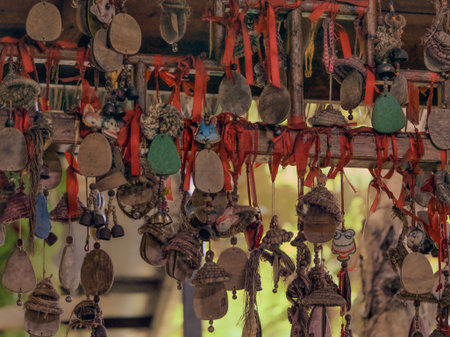 A vibrant display of hanging charms, talismans, and bells with red ribbons, symbolizing culture and belief.