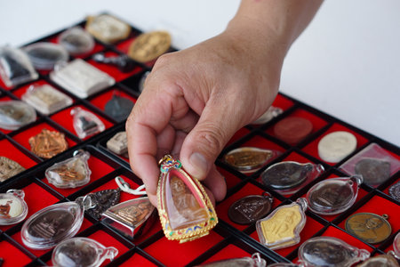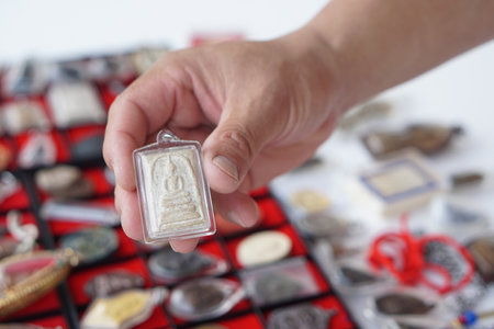 Closeup hand holds Thai Buddha amulet from amulet collection. Concept, faith and belief for Buddhist for holy and luck. Colleting amulet as hobbies, exchange, selling or buying