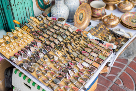 BANGKOK - THAILAND, APRIL 2, 2017: Big veriety of metal souvenirs on the street market of Bangkok, Thailand