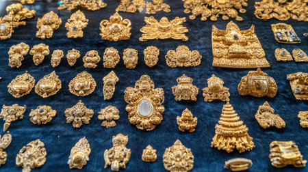 A stunning arrangement of golden temples showcases exquisite craftsmanship, reflecting traditional artistry with intricate designs and ornate details in a captivating display.