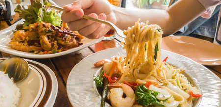 top view young asia woman eating in restaurant with seafood fried shrimp and rice on wood table background