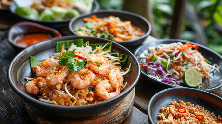This image showcases an artistic arrangement of various Asian dishes on a wooden table, featuring vibrant colors, fresh herbs, and unique flavors, perfect for food enthusiasts.