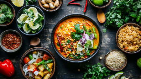A stunning display of Asian culinary delights, featuring rice, fresh herbs, flavorful sauces, and various delicious dishes, perfect for food enthusiasts.