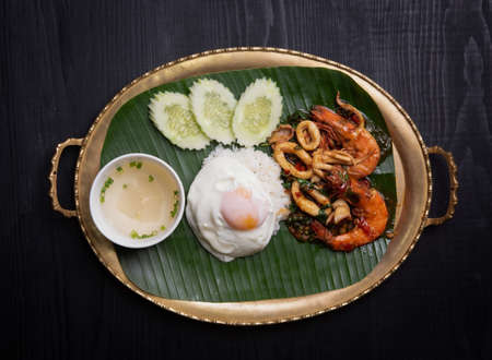 rice and stir-fried seafood (shrimps and squid) with basil , fired egg on the table,Thai style food