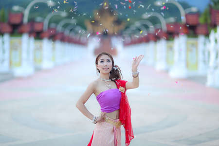 Beautiful young woman wearing Thai Songkran costume, a regional Thai costume dress in Chiang Mai, Thailand.