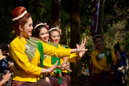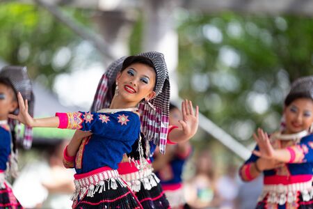 Thoet Thai, Chiang Rai - THAILAND, December 12, 2018 : Group of Shan or Tai Yai (ethnic group living in parts of Myanmar and Thailand) in tribal dress do native dancing in Shan New Year celebrations.