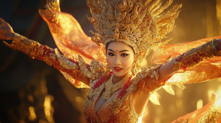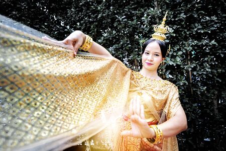 Beautiful Thai young woman portrait in Kinnaree traditional dress costume Art culture Thailand Dancing in masked khon Kinnaree in literature amayana, thailand culture Khon, Ayuttaya, Thailand .