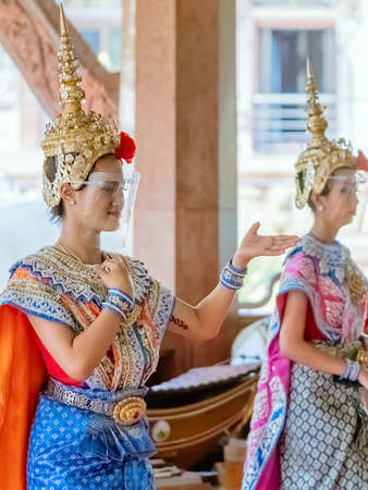 NAKHONPATHOM ,THAILAND-FEBRUARY 14,2021:Traditional Thai dance with protective face shield to prevent CoronaVirus(Covid-19) presented to spirit of PraRaaHoo to reward in return for giving him his wish