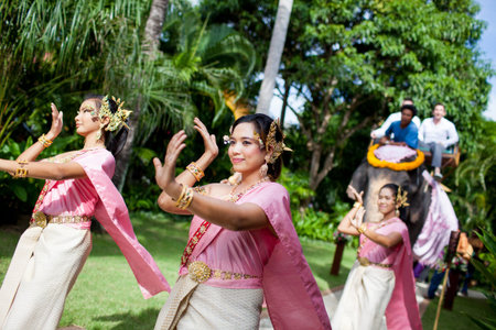 Thai women dancers with beautiful traditional dress performing Thai traditional dance leading the wedding procession with the gromm and groomsman sitting on the elephant.