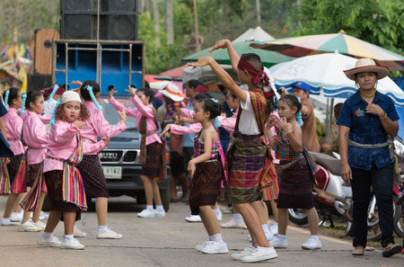 Bun Bang Fai (Rocket Festival), Dance to ask for rain water from the sky. Amnat Charoen, THAILAND, MAY 2018