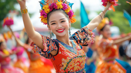 CHIANG MAI, THAILAND - FEBRUARY 08, 2020: The dancing lady in beautiful traditional clothes danced with delicacy in the 44th flower festival parade in Chiang Mai, Thailand