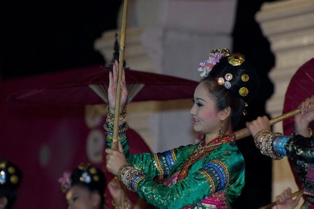 CHIANG MAI, THAILAND - JANUARY 15: Girls performing in national costumes during the annual Umbrella festival in Chiang Mai, Thailand on January 15, 2010. The festival is held in Bo Sang, where traditional umbrellas have been made for more than 100 years.
