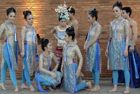 Traditional dancers on an evening in front of the old city wall at Pratu Tha Phae place in Chiang Mai in the north of Thailand in South East Asia