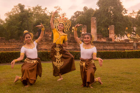 traditional dresst thai people at the Loy Krathong Festival in front of the Wat mahathat in the Historical Park in Sukhothai in the Provinz Sukhothai in Thailand. Thailand, Sukhothai, November, 2019