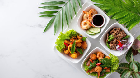 A vibrant and appetizing assortment of shrimp, beef, and vegetables elegantly arranged on a white platter, set against a marble background with fresh green leaves.