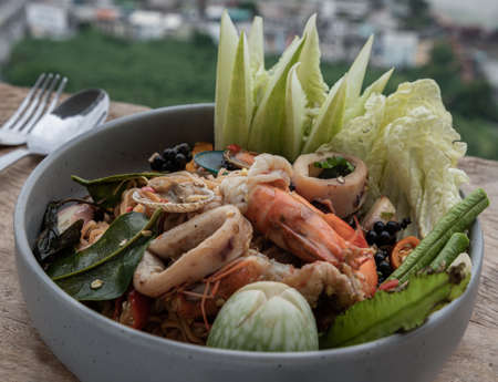 Spicy Stir Fried seafood Instant Noodles with herbs with various spices served with vegetables, cucumber, thai eggplant, chinese cabbage, white turmeric, winged bean and yardlong bean in ceramic plate. Selective focus.