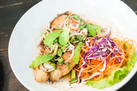 Fried catfish with spicy herbs, healthy dishes of Thailand on white plate.
