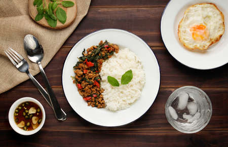 Top view of Thai traditional food, Stir fried minced pork with basil (Pad ka prao), rice, fried egg and chili fish sauce on black dinning table