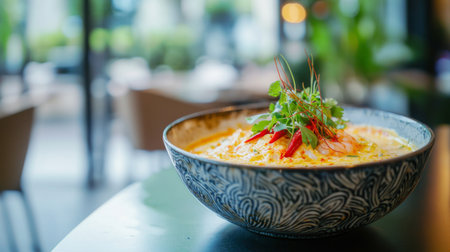 A Thai ceramic soup bowl filled with piping hot tom yum soup, garnished with fragrant herbs and spices.
