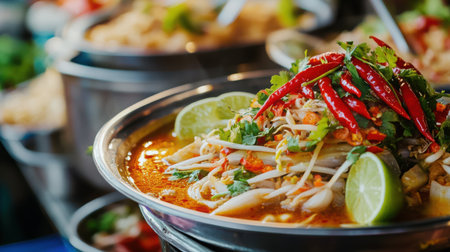 Thai spicy noodle soup with seafood and vegetables, Thailand.
