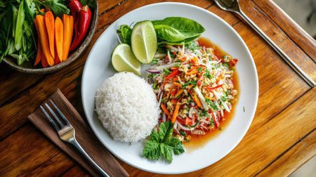 A vibrant Thai salad served with rice, fresh herbs, and lime, highlighting the flavors of healthy cuisine on a rustic wooden table. Perfect for any meal.