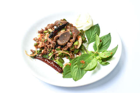 Thai spicy chop duck meat salad eat couple fresh cabbage and Vietnamese coriander on plate