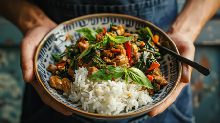 Person indulging in a plate of spicy Thai basil pork stir-fry (pad kra pao moo) with jasmine rice