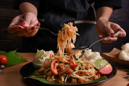 A waiter serving a traditional Thai Som Tum papaya salad with chili, lime, and peanuts.
