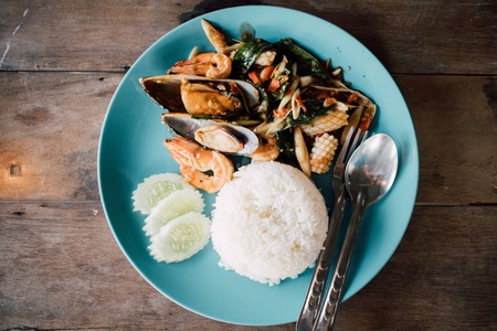 Fresh prepared asian spicy mixed seafood served with jasmine rice in local restaurant on Koh Mook island. Traditional thai cuisine made of fresh ingredients.