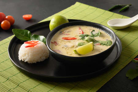 Asian Tom Kha Gai soup. Spicy coconut with chicken, cherry tomato.