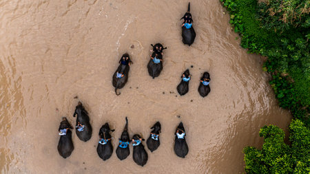 Aerial view asian elephant and Mahout enjoying bathing in river, Mahout bathe and clean asian elephant in the river, Chiang Mai, Thailand