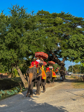 Bangkok, Thailand - November 11, 2024: Exotic elephants used for transport and tourism. Tourists being carried by elephants in a wildlife setting.