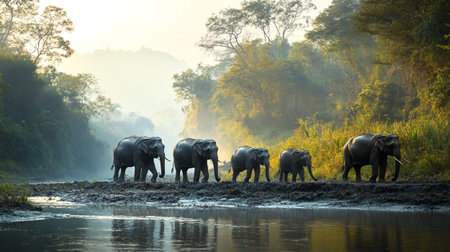 Elephants on nature river in deep nature forest at Thailand,Asia.