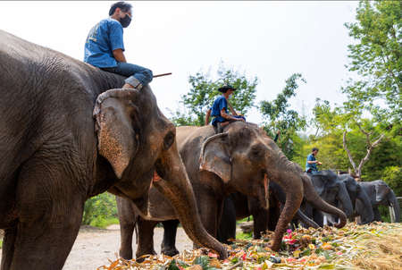 CHIANG MAI, THAILAND - MARCH 13 2022: Elephants enjoy various kinds of fruits and plants during an all-you-can-eat elephant buffet to mark the National Elephant Day at Maetaeng Elephant Park.