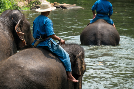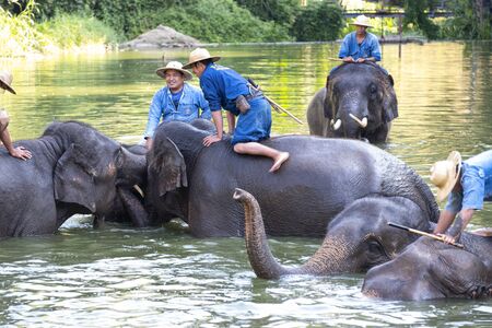 Chiangmai Thailand - March 24, 2019: Elephants taking a bath with mahout in river, in Chiang Mai Thailand.